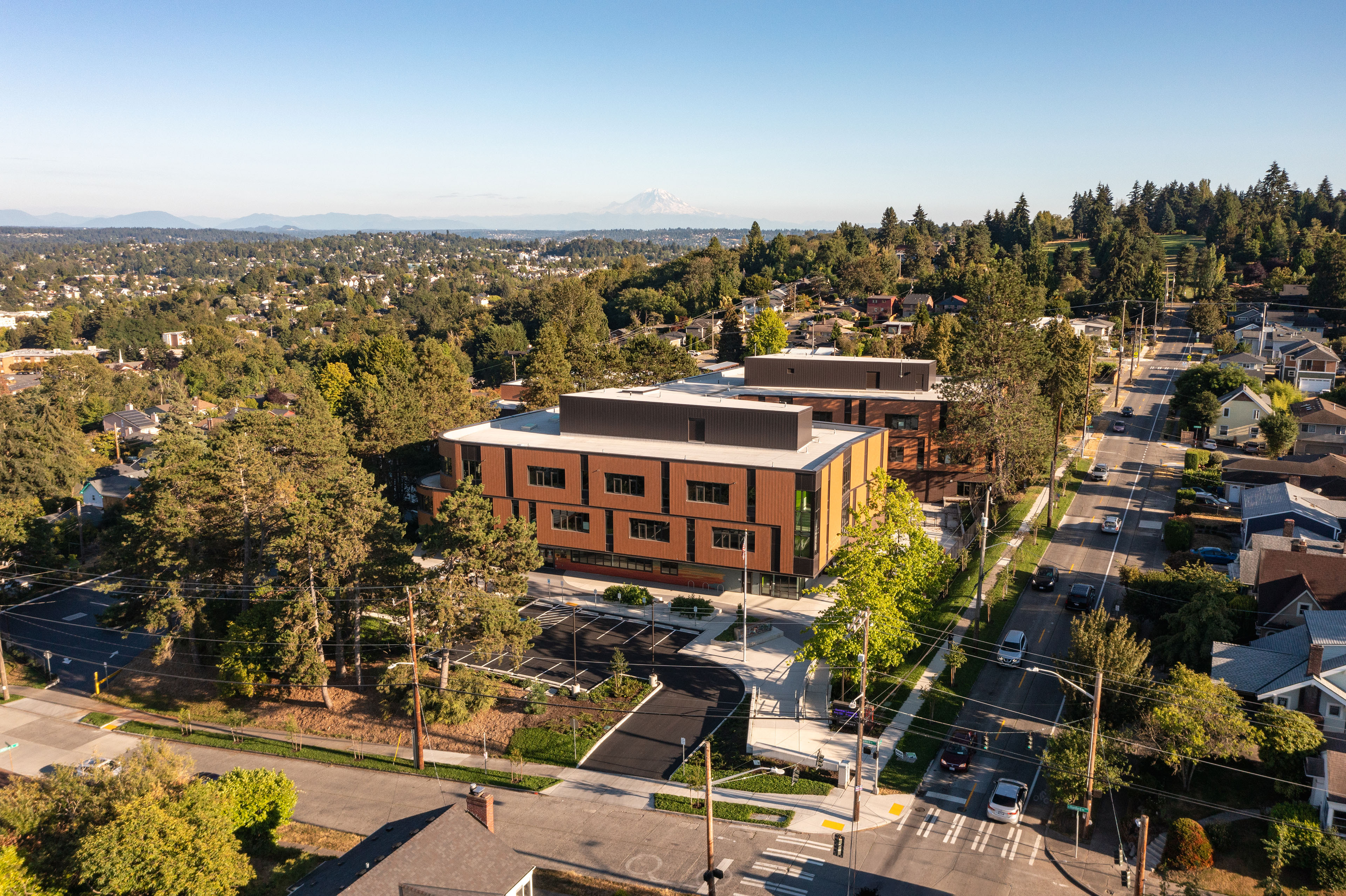 The project consolidated and expanded the core academic spaces of the school into two wings connected by a third volume containing the career center, expansion of the cafeteria, and the media center. Each classroom wing is centered around a two-story learning commons equipped with a variety of seating, an adjacent small group room, and a kitchenette. A central courtyard between the academic wings serves as an extension of the commons space and is oriented toward the spectacular view of Mount Rainier.